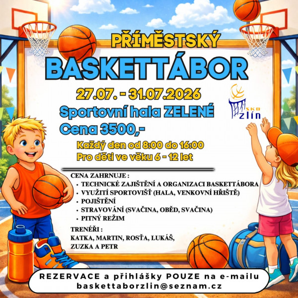 Sportovní klub basketbalu Zlín pořádá ve dnech od 27.7. - 31.7.2026 v areálu Sportovní haly Zelené v době od 8.00 hod do 16.00 hod pro děti ve věku 6 - 12 let, příměstský basketbalový tábor.